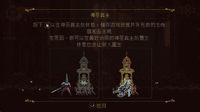 4.按下在神圣真主处休息,保存游戏进度并恢复生命值和圣水瓶,死亡后可以在最近的神圣真主处复活,休息还会使敌人复生