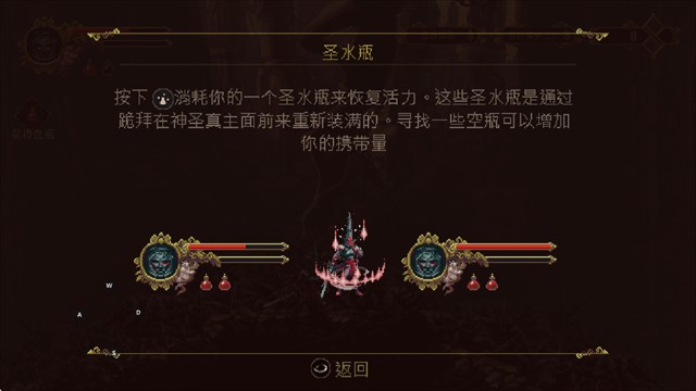 3.按下消耗一个圣水瓶以恢复生命值。这些圣水瓶可以通过在神圣真主面前跪拜来重新填充。寻找空瓶可以增加你的携带上限
